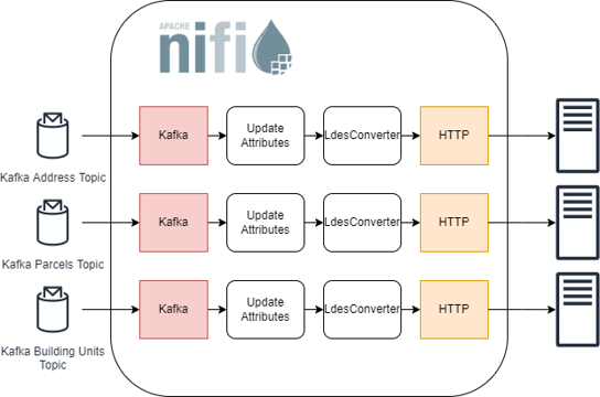 This GitHub repository demonstrates the configuration of transferring subscribed GRAR (Building units, addresses & parcels) Kafka data stream to the published substring fragmented LDES Stream using LDES Server. As we have no control over the GRAR system, the demo uses a JSON Data Generator which produces a continuous stream of addresses as an alternative to the GRAR system. Also, the Apache NIFI has standard Kafka Reader processors for subscribing to Kafka stream, please modify the nifi-workflow.json accordingly based on your environment. An example setup with Kafka can be as follow (GRAR.json), please modify the credentials for the Kafka topic accordingly:
