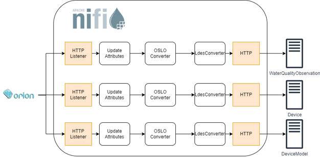 In this case, the OCB is integrated into the LDES ecosystem to publish context updates to an LDES stream. The VSDS NIFI solution is used to translate the context data into LDES events and publish them to the LDES stream via an update attributes processor, an OSLO converter processor, and an LdesConverter process NIFI pipeline.
